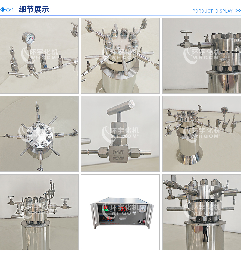 常規(guī)釜蓋開(kāi)口 氣相口配針形閥,液相口配針形閥及釜內(nèi)插底管,固體加料口配絲堵,測(cè)控溫口配鉑電阻,壓力表安全爆破口配壓力表及安全防爆裝置,釜內(nèi)冷卻盤(pán)管進(jìn)、出口配水咀