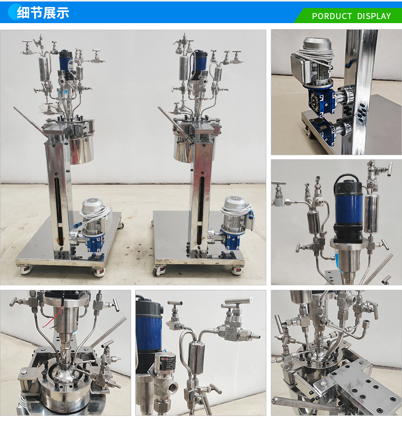 常規(guī)釜蓋開口 氣相口配針形閥,液相口配針形閥及釜內插底管,固體加料口配絲堵,測控溫口配鉑電阻,壓力表安全爆破口配壓力表及安全防爆裝置,釜內冷卻盤管進、出口配水咀